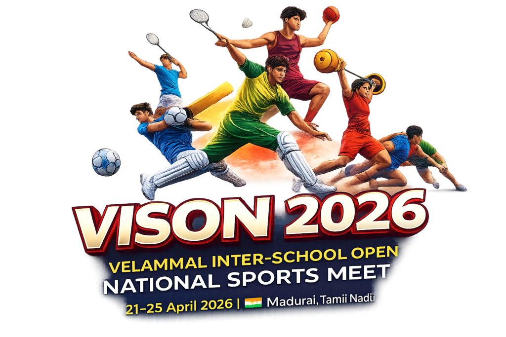 VISON 2026 is the Velammal Inter-School Open National Sports Meet hosted by Velammal Global School, Madurai. The event brings together school athletes from across India to compete in multiple sporting disciplines in a professionally organized national-level tournament environment that promotes sportsmanship, competition, and student development.