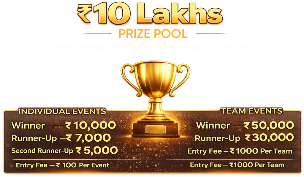 VISON 2026 offers attractive cash prizes and trophies. In individual events, the *winner receives ₹10,000, the runner-up ₹7,000, and the second runner-up ₹5,000. For team events, the **winning team receives ₹50,000 and the runner-up team receives ₹30,000. In addition, an **Overall Best School Trophy* will be awarded to the top-performing school in the championship.