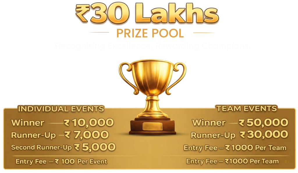 VISON 2026 offers attractive cash prizes and trophies. In individual events, the *winner receives ₹10,000, the runner-up ₹7,000, and the second runner-up ₹5,000. For team events, the **winning team receives ₹50,000 and the runner-up team receives ₹30,000. In addition, an **Overall Best School Trophy* will be awarded to the top-performing school in the championship.